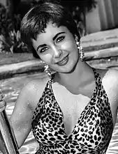 Taylor is considered a fashion icon both for her film costumes and personal style.[110][111][112] At MGM, her costumes were mostly designed by Helen Rose and Edith Head,[113] and in the 1960s by Irene Sharaff.[111][114] Her most famous costumes include a white ball gown in A Place in the Sun (1951), a Grecian dress in Cat on a Hot Tin Roof (1958), a green A-line dress in Suddenly Last Summer (1959), and a slip and a fur coat in BUtterfield 8 (1960).[110][111][112] Her make-up look in Cleopatra (1963) started a trend for "cat-eye" make-up done with black eyeliner.[8]: 135–136