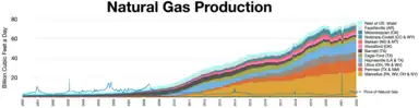Around 2010, many other trends began to reverse. By 2020, improvements in fracking had allowed natural gas production to increase by more than half,[17] while coal decreased by half.