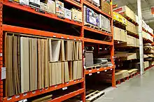 Particle board is manufactured from wood chips, sawmill shavings, or even sawdust, and a synthetic resin or another suitable binder, which is pressed and extruded.[11] Research published in 2017 showed that durable particle board can be produced from agricultural waste products, such as rice husk or guinea corn husk.[12] Particleboard is cheaper, denser, and more uniform than conventional wood and plywood and is substituted for them when the cost is more important than strength and appearance. A major disadvantage of particleboard is that it is very prone to expansion and discoloration due to moisture, particularly when it is not covered with paint or another sealer. Particle board is used in non-structural applications.