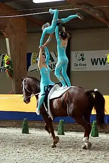 Equestrian vaulting, or simply vaulting,[1] is most often described as gymnastics and dance on horseback, which can be practiced both competitively or non-competitively.[2] Vaulting has a history as an equestrian act at circuses,[3][4] but its origins stretch back at least two-thousand years. It is open to both men and women and is one of ten equestrian disciplines recognized by the International Federation for Equestrian Sports (Fédération Équestre Internationale or FEI).[5] Therapeutic or interactive vaulting is also used as an activity for children and adults who may have balance, attention, gross motor skill or social deficits.