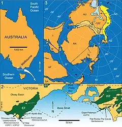 The Eumeralla Formation was deposited within the Otway Basin, which at the time of deposition was part of an extensional rift valley system formed between Australia and Antarctica. The lithology primarily consists of fluvially deposited siliciclastics derived from volcanic material. The strata of the Eumeralla Formation are folded as a result of northwest–southeast crustal compression during the Neogene, which also reactivated some Cretaceous aged normal faults.[2] It is one of three major fossiliferous deposits in Victoria dating to the Early Cretaceous, including the older Wonthaggi Formation and the Koonwarra fossil bed (which some authors have considered part of the Eumeralla Formation).[3]