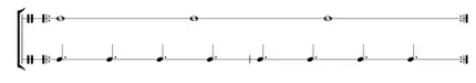 The following bell pattern is used in the Ewe rhythm kadodo.[13] The 24-pulse pattern crosses the barline, contradicting the meter with three sets of five strokes, across eight main beats (two measures of four main beats each). The three single strokes are muted.
