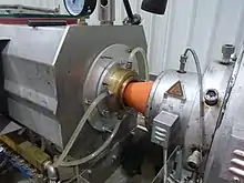 In 1950, Ugine Séjournet, of France, invented a process which uses glass as a lubricant for extruding steel.[18] The Ugine-Sejournet, or Sejournet, process is now used for other materials that have melting temperatures higher than steel or that require a narrow range of temperatures to extrude, such as the platinum-iridium alloy used to make kilogram mass standards.[19] The process starts by heating the materials to the extruding temperature and then rolling it in glass powder. The glass melts and forms a thin film, 20 to 30 mils (0.5 to 0.75 mm), in order to separate it from chamber walls and allow it to act as a lubricant. A thick solid glass ring that is 0.25 to 0.75 in (6 to 18 mm) thick is placed in the chamber on the die to lubricate the extrusion as it is forced through the die. A second advantage of this glass ring is its ability to insulate the heat of the billet from the die. The extrusion will have a 1 mil thick layer of glass, which can be easily removed once it cools.[4]