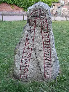 The term félag is mentioned on a broad range of runic inscriptions,[6] most notably in the form félagi (see etymology section), in these contexts meaning "comrade", "weapon brother" or "partner". Runestones that use a form of the term félag include Sö 292 in Bröta, Vg 112 in Ås, Vg 122 in Abrahamstorp, the now-lost Vg 146 in Slöta, Vg 182 in Skattegården, U 391 in Villa Karlsro, the now-lost U 954 in Söderby, DR 1 in Haddeby, DR 66 and DR 68 in Århus, DR 125 in Dalbyover, DR 127 in Hobro, DR 262 in Fosie, DR 270 in Skivarp, DR 279 in Sjörup, DR 316 in Norra Nöbbelöv, DR 318 in Håstad, DR 321 in Västra Karaby, DR 329 and DR 330 in Gårdstånga, DR 339 in Stora Köpinge, and X UaFv1914;47 in Berezanj, Ukraina.