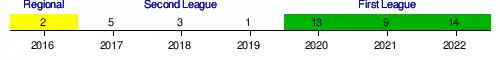 | 2016–17 | Second League | 2 | 30 | 14 | 6 | 10 | 54 | 39 | +15 | 48 | 5th | First Round | 13 | |||