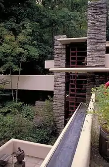 Wright had initially planned to have the house blend into its natural settings in rural Pennsylvania.[33] In doing so, he limited his palette to two colors, a light ocher for the concrete and his signature Cherokee red for the steel.[34]