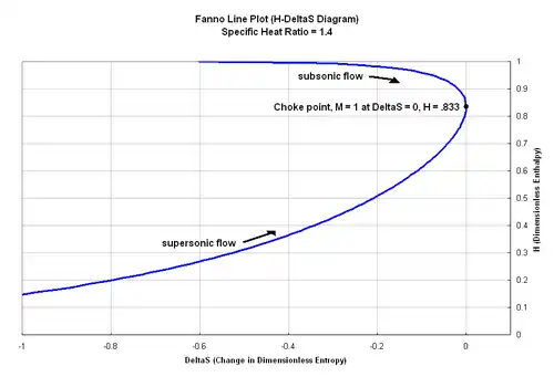 The equation above can be used to plot the Fanno line, which represents a locus of states for given Fanno flow conditions on an H-ΔS diagram. In the diagram, the Fanno line reaches maximum entropy at H = 0.833 and the flow is choked. According to the Second law of thermodynamics, entropy must always increase for Fanno flow. This means that a subsonic flow entering a duct with friction will have an increase in its Mach number until the flow is choked. Conversely, the Mach number of a supersonic flow will decrease until the flow is choked. Each point on the Fanno line corresponds with a different Mach number, and the movement to choked flow is shown in the diagram.