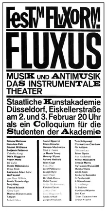 Lithuanian-born George Maciunas coined the name Fluxus for art produced by a range of artists with a shared sensibility as an attempt to 'fuse... cultural, social, & political revolutionaries into [a] united front and action'.[35] After fleeing Lithuania at the end of World War II, his family settled in New York, where he first met a group of avant-garde artists and musicians centered around John Cage and La Monte Young. After opening a short-lived art gallery on Madison Avenue, which showed work by Higgins, Yoko Ono, Jonas Mekas, Ray Johnson, Flynt and Young, Maciunas moved to Wiesbaden, West Germany, having taken a job as a graphic designer with the US Air Force in late 1961[36] after the gallery had gone bust. Maciunas first publicly coined the term Fluxus (meaning 'to flow') in a 'brochure prospectus' that he distributed to the audience at a festival he had organized, called Après Cage; Kleinen Sommerfest (After Cage; a Small Summer Festival), in Wuppertal, West Germany, 9 June 1962.[37]