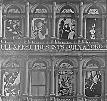 In 1969, Fluxus artist Joe Jones opened his JJ Music Store (aka Tone Deaf Music Store) at 18 North Moore Street, where he presented his repetitive drone music machines. He created there an installation in the window so that anyone could press numerous door buttons to play the noise music machines displayed there.[73] Jones also presented small musical installation performances there, alone or with other Fluxus artists, such as Yoko Ono and John Lennon,[74] among others. From April 18th to June 12th, 1970, Ono and Lennon (aka Plastic Ono Band) presented a series of Fluxus art events and concerts there called GRAPEFRUIT FLUXBANQUET. It was promoted with a poster designed by Fluxus leader George Maciunas. Performances included Come Impersonating John Lennon & Yoko Ono, Grapefruit Banquet (April 11-17) by George Maciunas, Yoshimasa Wada, Nye Ffarrabas (formerly Bici Forbes and Bici Forbes Hendricks), Geoffrey Hendricks, and Robert Watts; Do It Yourself (April 11-17) by Yoko Ono; Tickets by John Lennon + Fluxagents (April 18–24) with Wada, Ben Vautier and Maciunas; Clinic by Yoko Ono + Hi Red Center (April 25-May 1); Blue Room by Yoko + Fluxmasterliars (May 2-8); Weight & Water by Yoko + Fluxfiremen (May 9-15); Capsule by Yoko + Flux Space Center (May 16–22) with Maciunas, Paul Sharits, George Brecht, Ay-O, Ono, Watts, John Cavanaugh; Portrait of John Lennon as a Young Cloud by Yoko + Everybody (May 23–29); The Store by Yoko + Fluxfactory (May 30-June 5), with Ono, Maciunas, Wada, Ay-O; and finally Examination by Yoko + Fluxschool (June 6-12) with Ono, Geoffrey Hendricks, Watts, Mieko Shiomi and Robert Filliou.[75]