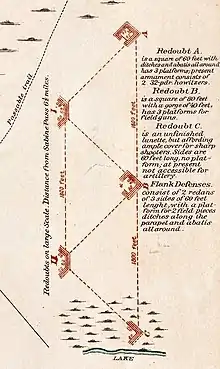 Fort Manhassett's siting and construction was built with a keen eye to the tactical terrain of the marshy plains west of Sabine City. To this day, the area consists of flat salt grass prairie with numerous marshes and several large shallow lakes inland of the beach. These large lakes are generally 6–8 feet (1.8–2.4 m) at their deepest, and the marshes support a huge variety of wildlife. The mile of open ground between Knight's Lake and the beach was selected as the site for the fort, as it was a natural chokepoint, with the road on Sabine Ridge providing a route of resupply and communication with the town. Colonel Valery Sulakowski, chief engineer of the Confederate engineering department in Texas, ordered his subordinate, Major Julius G. Kellersberger, to begin the construction of a series of redoubts, redans, and lunettes on the mile of open saltgrass prairie between Knight's Lake and the Gulf of Mexico.[8] Fort Manhassett consisted of two redoubts, two redans, and one lunette. Redoubt A, Redoubt B, and Redoubt C were built on a straight line, running north to south, between the beach road and the southern shore of the lake. The three redoubts were built to contain a possible enemy advance from the west, and mounted several heavy cannon for that purpose. The two redans in the rear, labelled Flank Defenses I and II on Kellersberg's 1863 map of the Sabine defenses, were intended to serve as a second line of defense in the event of the advance works falling to an attacking enemy. The shell road from Galveston to Sabine City ran between Redoubts A and B. Redoubt C, which was actually a redan, was sited in the marsh, making it inaccessible for artillery when first built;[9] however, it is possible that corduroy roads were later built to allow heavy weapons to be mounted in the work, much in the same manner that machinery and pipe fittings are transported to modern LNG terminals in the salt marshes of the Texas coast.