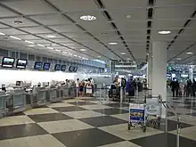 Check-in area at Terminal 2; the notable hanging sculpture advertising BMW has since been removed.
