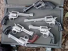 A number of variants upon the Model 83 have been produced, all with five-shot cylinders. The first was a .45 Colt in February 1986 (54 examples sold 1986–1989, serial numbers E7201-E7254), followed closely by a .44 Magnum version.[5] In 1991, Freedom Arms introduced the Model 252 in .22 long rifle and in 1992 the model 353 in .357 Magnum, including a 9-inch variation produced to meet the 4lb maximum weight requirement for IHMSA Silhouette competition. In 1993, the Model 555 was introduced in .50 Action Express, .41 Magnum, and .475 Linebaugh chamberings were introduced in 1997 and 1999 respectively.[1][6] Freedom Arms introduced their own .500 Wyoming Express in the Model 83 .500 WE in 2005.[7]