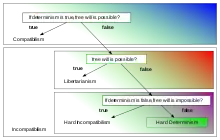 Some conceive free will to be the capacity to make choices undetermined by past events. Determinism suggests that only one course of events is possible, which is inconsistent with a libertarian model of free will.[2] Ancient Greek philosophy identified this issue,[3] which remains a major focus of philosophical debate. The view that conceives free will is incompatible with determinism is called incompatibilism and encompasses both metaphysical libertarianism (the claim that determinism is false and thus free will is at least possible) and hard determinism (the claim that determinism is true and thus free will is not possible). Another incompatibilist position is hard incompatibilism, which holds not only determinism but also indeterminism to be incompatible with free will and thus free will to be impossible whatever the case may be regarding determinism.
