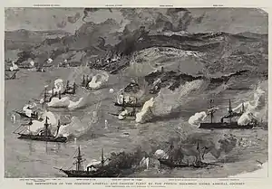 She had arrived in the region by March 1884, and at that time, the squadron also included the ironclad warships La Galissonnière (the flagship) and Triomphante, the unprotected cruisers Duguay-Trouin, Villars, and Volta, and the gunboat Lutin.[6] France's campaign to occupy Vietnam, a traditional subject of Qing China, led to clashes between French and Chinese forces, and ultimately, to the start of the Sino-French War in August 1884 with the Keelung campaign on the island of Formosa early that month. Following the action there, Courbet began assembling ships off Fuzhou to attack the Chinese Fujian Fleet that was stationed there. D'Estaing reached the squadron there on 16 August.[7]