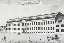 A military hospital was first opened at the site from 1673 when it took over the so-called Gold House, an alchemist laboratory.[1] In 1683, Christian V purchased the buildings and used them as a textile factory.[2] They were destroyed by fire in 1759 and replaced by a new building (Det Kgl. Uldmanufaktur) built by Georg Vollmeister in 1760 and extended in 1777–79 to a similar design. From 1799 to 1800, court architect Andreas Kirkerup was responsible for another extension of the building Known as Monderingsdepotet (No. 11). It was used by the Garrison Hospital from 1809.