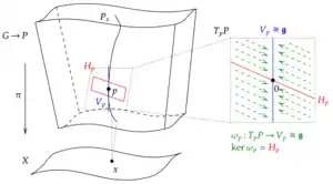 The choice of horizontal subspaces may be equivalently expressed by a projection operator which is equivariant in the correct sense, called the connection one-form. For a horizontal distribution , this is defined by where denotes the decomposition of a tangent vector with respect to the direct sum decomposition . Due to the equivariance, this projection one-form may be taken to be Lie algebra-valued, giving some .