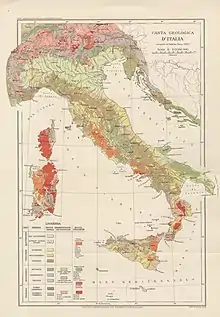 The geology of Italy includes mountain ranges such as the Alps and the Apennines formed from the uplift of igneous and primarily marine sedimentary rocks all formed since the Paleozoic.[1] Some active volcanoes are located in Insular Italy.
