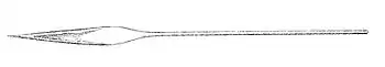The gladius (plural: gladii), or pen, is a hard internal bodypart found in many cephalopods of the superorder Decapodiformes (particularly squids) and in a single extant member of the Octopodiformes, the vampire squid (Vampyroteuthis infernalis).[1] It is so named for its superficial resemblance to the Roman short sword of the same name, and is a vestige of the ancestral mollusc shell, which was external.[1] The gladius is located dorsally within the mantle and usually extends for its entire length. Composed primarily of chitin, it lies within the shell sac, which is responsible for its secretion.[1][2]