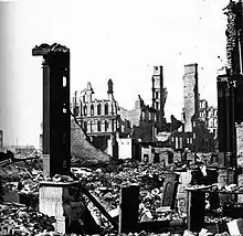 Once the fire had ended, the smoldering remains were still too hot for a survey of the damage to be completed for many days. Eventually, the city determined that the fire destroyed an area about 4 miles (6 km) long and averaging 34 mile (1 km) wide, encompassing an area of more than 2,000 acres (809 ha).[1]:159 Destroyed were more than 73 miles (117 km) of roads, 120 miles (190 km) of sidewalk, 2,000 lampposts, 17,500 buildings, and $222 million in property,[1] which was about a third of the city's valuation in 1871.[3]