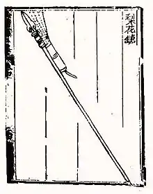 Gunpowder was invented in China during the 9th century.[21][22][23] The first firearm was the fire lance, which appeared in China between the 10–12th centuries.[24][25][26] It was depicted in a silk painting dated to the mid-10th century, but textual evidence of its use does not appear until 1132, describing the siege of De'an.[24] It consisted of a bamboo tube of gunpowder tied to a spear or other polearm. By the late 1100s, ingredients such as pieces of shrapnel like porcelain shards or small iron pellets were added to the tube so that they would be blown out with the gunpowder.[27] It was relatively short ranged and had a range of roughly 3 meters by the early 13th century.[28] This fire lance is considered by some historians to be a "proto-gun" because its projectiles did not occlude the barrel.[15] There was also another "proto-gun" called the eruptor, according to Joseph Needham, which did not have a lance but still did not shoot projectiles which occluded the barrel.[16]