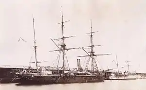 The vessels of the class were barque-rigged, but some of the pictures show yards on the mizzen mast, which would have made them ship rigged. The advantage of the barque rig was the need for less manpower, but on a distant station and with an experienced crew, and infrequent coaling stops, captains sometimes preferred to gain the greater sailing benefits of the ship rig, and had the flexibility to do so.