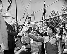 Truman was brought up in the Presbyterian and Baptist churches,[54] but avoided revivals and sometimes ridiculed revivalist preachers.[55] He rarely spoke about religion, which to him, primarily meant ethical behavior along traditional Protestant lines.[56] Truman once wrote in a letter to his future wife, Bess: "You know that I know nothing about Lent and such things..."[57] Most of the soldiers he commanded in the war were Catholics, and one of his close friends was the 129th Field Artillery's chaplain, Monsignor L. Curtis Tiernan.[58] The two remained friends until Tiernan's death in 1960.[59] Developing leadership and interpersonal skills that later made him a successful politician helped Truman get along with his Catholic soldiers, as he did with soldiers of other Christian denominations and the unit's Jewish members.[60][61]