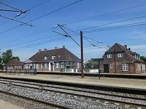 The current station building was built in 1917 to designs by Danish architect Heinrich Wenck, known for the numerous railway stations he designed across Denmark in his capacity of head architect of the Danish State Railways from 1894 to 1921.