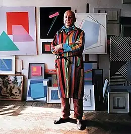 Between 1960 and 1962, Stażewski held three exhibitions at the Crooked Circle Gallery in Warsaw. He continued to show his relief work, including a series called White Reliefs made in 1961.[4]:132 In August 1961, several of these were included in Fifteen Polish Painters, a major exhibition of Polish contemporary art at the Museum of Modern Art in New York, alongside works by Wojciech Fangor, Tadeusz Kantor and Jan Lebenstein, among others. Focused almost exclusively on non-representational art and organized by a major U.S. institution, the show championed abstraction as a symbolic manifestation of Poland's cultural and political freedom during the Cold War era.[30] Also in 1961, art dealers Madeleine Chalette-Lejwa and Arthur Lejwa, the founders of Galerie Chalette in New York, featured Stażewski's work in a group exhibition, offering him an early exposure to the American market.[21]:133 Examining Stażewski's writings from that period, art historian Marta Zboralska argues that the artist saw himself as an "active contributor to the enquiry into abstraction throughout the 1960s and beyond".[31]:11 Distancing himself from the influences of Malevich and Mondrian, Stażewski stressed in an essay written in 1968 the impact of Johannes Itten and Josef Albers, two Bauhaus artists whose engagement with color theory was influential in both Europe and the US.[31]:12
