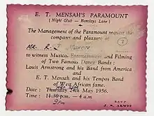 In the 1940s, the music diverged into two distinct streams: dance band highlife and guitar band highlife. Guitar band highlife featured smaller bands and, at least initially, was most common in rural areas. Because of the history of stringed instruments like the seprewa in the region, musicians were happy to incorporate the guitar. They also used the dagomba style, borrowed from Kru sailors from Liberia, to create highlife's two-finger picking style.[4] Guitar band highlife also featured singing, drums and claves. E.K. Nyame and his Akan Trio helped to popularize guitar band highlife,[7] and would release over 400 records during Nyame's lifetime.[4] Dance band highlife, by contrast, was more rooted in urban settings. In the post-war period, larger dance orchestras began to be replaced by smaller professional dance bands, typified by the success of E.T. Mensah and the Tempos. As foreign troops departed, the primary audiences became increasingly Ghanaian, and the music changed to cater to their tastes. Mensah's fame soared after he played with Louis Armstrong in Accra in May 1956, and he eventually earned the nickname, the "King of Highlife".[4] Also important from the 1950s onward was musician King Bruce, who served as band leader to the Black Beats. Some other early bands were, the Red Spots, the Rhythm Aces, the Ramblers and Broadway-Uhuru.