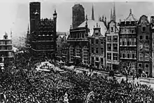 In 1440, the city participated in the foundation of the Prussian Confederation which was an organisation opposed to the rule of the Teutonic Knights. The organisation in its complaint of 1453 mentioned repeated cases in which the Teutonic Knights imprisoned or murdered local patricians and mayors without a court verdict.[21] On the request of the organisation King Casimir IV Jagiellon reincorporated the territory to the Kingdom of Poland in 1454.[22][23] Since 1454, the city was authorized by the King to mint Polish coins.[24] The local mayor pledged allegiance to the King during the incorporation on March 6, 1454, in Kraków,[25] and the city again solemnly pledged allegiance to the King in June 1454 in Elbląg, recognizing the prior Teutonic annexation and rule as unlawful.[26] In 1457, King Casimir IV vested the city was new privileges. During the resulting Thirteen Years' War (1454–1466), the fleet of Danzig fought on the side of Poland in several battles, scoring important victories in the Battle of Bornholm (1457) and the Battle of Vistula Lagoon (1463). The war ended in 1466 with the Order's defeat. With the Second Peace of Thorn (1466), the Teutonic Knights renounced claims to the city and recognized it as part of Poland, within which it was administratively located in the Pomeranian Voivodeship in the province of Royal Prussia (later also part of the Greater Poland Province).