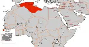 Ibrahim ibn al-Aghlab (r.800-812) and his descendants, known as the Aghlabids (800-909), ruled in Ifriqiya from 800 to 909. The Aghlabids were predominantly of an Arab tribe the Bani Tamim. At that time there were perhaps 100,000 Arabs living in Ifriqiya, but of course the Berbers constituted the great majority.[68] The Aghlabid military forces were drawn from: (a) immigrant Arab warriors (both those recently sent against the Berber Kharajite revolts, and those descendants of earlier Arab invasions), (b) Islamized and bilingual natives (Afariq), the Roman Africans, most of whom were Berbers, and (c) black slave soldiers from the south. The black soldiery formed the ruler's last resort.[69][70]