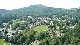 Hochwald (Czech Hvozd) is a mountain on the border of Saxony in southeastern Germany and Bohemia in the Czech Republic. It is at 749.5 metres (2,459 ft) above sea level, one of the highest in the Lusatian/Zittau ranges, directly on the Czech/German border. It has two peaks, the southern main summit (through which the state border extends), which lies 743.8 metres (2,440 ft) above sea level, and the north summit, which is 370 metres (1,210 ft) away. Due to the visually appealing views from the mountain, it has earned the nickname Aussichtsturm des Zittauer Gebirges (lit. Lookout Tower of the Zittau Mountains).