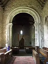 The font is of the late 12th century; it is an octagonal block with two shallow arches carved on each side, supported by a thick central shaft and four slender shafts.[2][6]