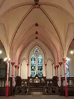 The first episode of redecoration and repair of the church interior and churchyard occurred during Digby Walsh's tenure as vicar, i.e. sometime between 1858–1869, with a second taking place in 1884. Records are unclear about the intervening period, but the church was again redecorated completely in 1967-8, and as part of the redecoration the half-shafts of the pillars on the walls were removed, apart from at the far east and west ends of the church.[1] In 2009 the church was repaired and redecorated internally, with the colour scheme changing from blues and stone colours to reds, pinks, white and gold.