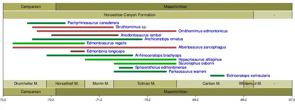 - ↑ Eberth, David A.; Kamo, Sandra (2019). "High-precision U-Pb CA-ID-TIMS dating and chronostratigraphy of the dinosaur-rich Horseshoe Canyon Formation (Upper Cretaceous, Campanian–Maastrichtian), Red Deer River valley, Alberta, Canada". Canadian Journal of Earth Sciences. 57 (10): 1220–1237. doi:10.1139/cjes-2019-0019. S2CID 210299227.