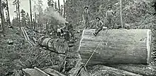 The logging system in Converse Basin used a network of chutes to transport timber from the woods to the mill.[22] The chutes were made of logs placed parallel to each other and supported by trestles or crib work on steep slopes. They were powered by donkey engines and were used to move logs that were 10 to 24 feet long and up to 10 feet in diameter. A trail rider at the end of the train of logs used a bell system to communicate with the hoist operator at the mill and control the movement of the logs. The process was dangerous, as logs could roll out of the chutes or the train could buckle, causing logs to fly off the chute and potentially start fires.[8]: 70–73 The chutes replaced the use of ox carts in logging and, with the introduction of donkey engines, eventually replaced the use of animals in logging altogether.[23]: 103 This change had long-term ecological consequences, as the wood-burning donkey engines needed fuel and consumed logging waste, undergrowth, and immature trees that would otherwise remain, compounding the destructive effect of clear-cutting on forest regeneration.