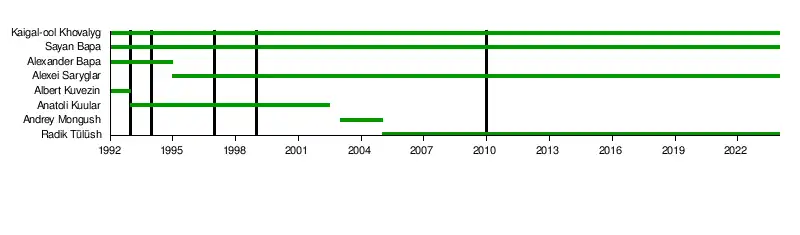 In 2003, Kuular quit the group and was replaced by Andrey Mongush, an experienced teacher of khöömei and Tuvan instruments.[2] Mongush's tenure with the group was short and in 2005 he was replaced by Radik Tülüsh, formerly of Yat-Kha fame.[3]
