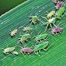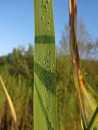 | Colony of Hyalopterus pruni on Phragmites australis | |
