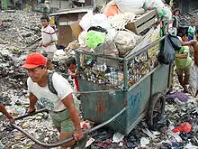Most collectors use only two tools:[4] a metal tip or hook to turn the waste over, and a plastic bag to collect it. The use of vehicles such as the cart shown here seems to be reserved for organised groups given their prohibitive cost. Protective equipment is very rare; when it is present, it is often the result of action by a local or international organisation.