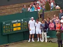 As for Mahut, his doubles match with partner Arnaud Clément against Colin Fleming and Ken Skupski started late in the evening on 24 June (also on Court 18); the match was suspended after Mahut and Clément had lost the first set. On 25 June, Mahut/Clément – Fleming/Skupski was scheduled as the fourth match on Court 18 because Clément had a third-round singles match on Centre Court against Roger Federer.[27] Because the match between Daniel Brands and Victor Hănescu lasted almost 3 hours, 30 minutes and ended around 8:45 pm local time,[28] the doubles match was postponed again; it was rescheduled as the first match on Court 14 on 26 June.[29] On resumption, Fleming/Skupski defeated Mahut/Clément, 7–6, 6–4, 3–6, 7–6.
