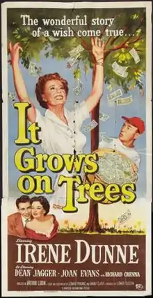 It Grows on Trees is a 1952 American fantasy comedy film directed by Arthur Lubin and starring Irene Dunne in her final screen role. The cast also featured Dean Jagger, Joan Evans and Richard Crenna.[1] It was produced and distributed by Universal Pictures.