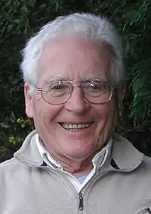 James Lovelock was born in Letchworth Garden City to Tom Arthur Lovelock and his second wife Nellie.[7] Nell, his mother, was born in Bermondsey and won a scholarship to a grammar school but was unable to take it up, and started work at thirteen in a pickle factory. She was described by Lovelock as a socialist and suffragist, who was also anti-vaccine, and did not allow Lovelock to receive his smallpox inoculation as a child.[8] His father, Tom, was born in Fawley, Berkshire, had served six months hard labour for poaching in his teens, and was illiterate until attending technical college, later running a bookshop.[9] Lovelock was brought up a Quaker and imbued with the notion that "God is a still, small voice within rather than some mysterious old gentleman way out in the universe", which he thought was a helpful way of thinking for inventors, but he would eventually end up as being non-religious.[10] The family moved to London, where his dislike of authority made him, by his own account, an unhappy pupil at Strand School in Tulse Hill, south London.[11]