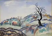 Later that year, he was given a solo exhibition of Adirondack Landscapes at the 56th Street Galleries in Manhattan.[83][note 12] In 1943, 15 years after a Red Cross benefit in the First World War, Rosenberg showed watercolors and pastels at the Ferargil Gallery with proceeds from sales once again to benefit the American Red Cross.[85][note 13] Reviewing the show in the Brooklyn Daily Eagle, the critic, A.Z. Kruse said, "Mr. Rosenberg holds his own admirably, even in this hectic week filled with proficient exhibitions." He wrote that the paintings showed "creative realism" and a "basic charm" and praised the show's watercolors as among the best then being produced.[87][note 14] "Spring Valley," shown at right, illustrates his watercolor technique at this time. Rosenberg showed at Ferargil again the following year. The show featured paintings that differed greatly from his usual serene landscapes. Some depicted what a critic called the "smoke and flame" of Pittsburgh's steel mills and others the horrors of war and oppression.[89] At that time a feature writer for the New York Post interviewed him for a lengthy profile in which he admitted that while he painted for the pleasure of it, the impetus for these paintings came from a necessity to express his feelings about the state of the world in the midst of the Second World War.[7]