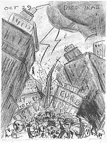 In 1911, he achieved a feat that was out of reach for most beginning artists when Louis Katz gave him a solo exhibition at his eponymous commercial art gallery on West 74th Street in Manhattan.[note 6] An equally unlikely outcome was a long and appreciative review of this exhibition in the Brooklyn Daily Eagle. Crediting Rosenberg with a "poetic sense," the paper's critic said the 40 pastels in the show were "sensitive and quietly impressive rather than bold and big in style, color," and added, "the subtle handling of themes are important points in the work." This critic went on to give favorable appraisals of many works by name, writing, for example, that "'Jamaica Bay, Emerald and Mauve,' shows a remarkable scenic effect, with its green-shot water and mauve areas. There are some evening effects with lights of big hotels along the shore, piercing the remembrance of sunset in the sky."[63] A critic for the New York Times was also impressed by the show, saying the pastels were "refined in color and show[ed] a vision sensitive to beauty." Of two of them, this critic wrote, "'Wet Street,' is a poetic transcription of a scene many times noted by the artists of the city, and 'Steam and Mist' is another successful version of the mysterious and exquisite effects with which New York clothes her medley of architecture."[67] In 1913, Rosenberg received a second solo exhibition of pastels, this time at the Arlington Art Galleries in Brooklyn, and, once again, the works displayed received favorable critical notice.[note 7] One critic praised a "refinement and practiced hand" and another said the pictures had "refined color and much feeling for nature."[69][70] A third critic was almost effusive, writing, "Many men aim at poetry through the medium of pictorial art, but it is not often they achieve the lyric bays so truly as this painter has done in this little group of pastels."[71][note 8] In 1916, he contributed a painting to the annual exhibition of the New York Water Color Club.[72] In 1917, he exhibited in the first group exhibition held by the Society of Independent Artists.[73] The following year he showed pastels at the Anderson Galleries with all proceeds from sales to be donated to the Red Cross.[note 9] The show included landscapes and still lifes. A critic for the New York Tribune praised one of the former, "Scattering Clouds," as a "strong piece of work" revealing "deep blue mountains" against an "exquisite turquoise sky."[75] In 1921, he showed with Marsden Hartley at the Anderson Galleries.[64] The following year Rosenberg helped found a gallery called The New Gallery (and was called one of the gallery's "leading spirits and godfather").[8][76] The gallery was financed in part by an innovative scheme, the New Gallery Club, begun in February 1923. The club supported the gallery through its membership fees and it raised funds and publicized exhibitions by means of entertainments, teas, and receptions. Many club members were amateur artists whose work the gallery showed in special exhibitions.[77] In 1924, Rosenberg showed three paintings in a group exhibition at the gallery.[76] Four years later, he held a solo exhibition of Adirondack Mountain landscapes at the Erich Galleries.[65][note 10] At that time he told an interviewer that he painted simply for the joy of it. He said, "I have no suppressed longing to live in the South Seas and do nothing but paint. And I have no 'message' to give the world. I happen to be very fond of the Adirondacks, and my summer home is located among them."[65] His painting, "Adirondack Cloudburst," of 1946 (shown at right) is one of many mountain landscapes he made in the course of his career. In 1928, he contributed two paintings to a group exhibition of the Salons of America at the Anderson Galleries.[80][note 11] In 1929, Rosenberg departed from the style of painting and subject matter of his earlier work when he produced what turned out to be his best-known piece, a lithograph called "Dies Irae" (Day of Wrath), showing the October 29, 1929, Wall Street Crash as a horrific scene of destruction. On January 12, 1930, the New York Times put a reproduction of the lithograph on the front page of its Sunday magazine.[82] "Dies Irae" is shown at left.