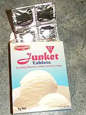 Junket is a milk-based dessert, made with sweetened milk and rennet, the digestive enzyme that curdles milk. Some older cookery books call the dish curds and whey.[1]