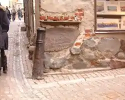 First mentioned in 1477, and in more detail in 1496, the street is initially called Kakbringkin. This derives from the old Swedish word kak which is the equivalent of the modern Swedish kåk, meaning "ramshackle house" or "prison", but at the time it referred to a pillory placed on Stortorget.[1] The pillory is first mentioned in connection with the so-called "Käpplinge murders" (Käpplingemorden). This was an incident in 1389 when a group of German burghers imprisoned about 70 prominent citizens in a hovel on Blasieholmen (at the time called Käpplinge) and burned them alive. The Germans are said to have been led from the Royal Palace to the pillory.[1][2] A copper statue of a man holding a birch in his right hand, placed on top of the pillory in 1602, was replaced in 1647 by a new one in bronze which is still preserved in the Town Hall. The pillory was moved to Norrmalmstorg in 1776, and from there to Eriksbergsplan in 1810.[1]