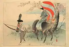 Kōgyo Tsukioka (月岡 耕漁, Tsukioka Kōgyo), sometimes called Kōgyo Sakamaki (坂巻 耕漁, Sakamaki Kōgyo), (April 18, 1869 – February 25, 1927) was a Japanese artist of the Meiji period. He was a student and adopted son of Tsukioka Yoshitoshi, and also studied with Ogata Gekkō. Although Kōgyo sometimes painted other subjects, for most of his career he made pictures of Japanese noh theatre, either as large-scale paintings or colored woodblock prints. Many of the latter were published in series and sold as multi-volume sets. Some sets, such as Nōgaku zue, have been preserved as albums in their original bindings, including accordion-style bindings known as orihon, while other sets such as Nōga taikan, were issued in sewn bindings known as yamato toji. Although most bound sets belong to institutional collections, individual prints by Kōgyo can still be found through dealers specializing in Japanese prints.