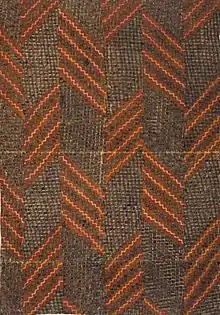 Similar to tapa found elsewhere in Polynesia (the Hawaiian phoneme /k/ corresponds to /t/ in most other Polynesian languages), kapa differs in the methods used in its creation. Kapa is based primarily on the creative combination of linear elements that cross and converge to form squares, triangles, chevrons, and diagonal forms, giving a feeling of boldness and directness.[1] Kapa was used primarily for clothing like the malo worn by men as a loincloth and the pāʻū worn by women as a wraparound. Kapa was also used for kīhei, a shawl or cape worn over one shoulder.[2] Other uses for kapa depended on caste and a person's place in ancient Hawaiian society.
