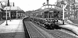 The station was built with two platforms, the up platform to accommodate eastbound services and the down platform for westbound trains. A two-storey building of local stone, was constructed on the down platform; its upper storey housed the company's boardroom and offices for the company secretary, train coordinator and accountant, while the lower storey was occupied by the ticket office, luggage and parcels office, lavatories and waiting rooms. The waiting rooms opened onto the platform, most of which was protected by a glazed roof on top of a cantilevered valance, supported on rows of iron columns. The eastbound up platform had a waiting shelter and a large rectangular water tank.[1]