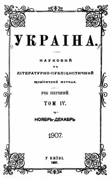 After Kievaskaia starina ceased to be published, in 1907 Naumenko continued to publish a monthly magazine under name Ukraina for a year.